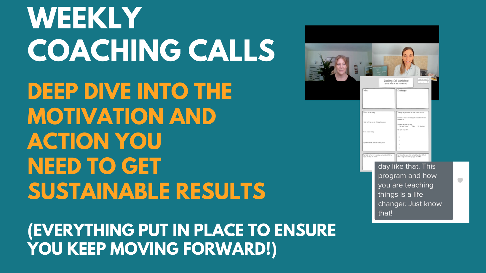 I'll meet you on Zoom to coach, troubleshoot, and answer all your questions. We'll meet every week for 12 weeks even when life is imperfect so we encounter all life's obstacles, and you'll create LONG-TERM success.