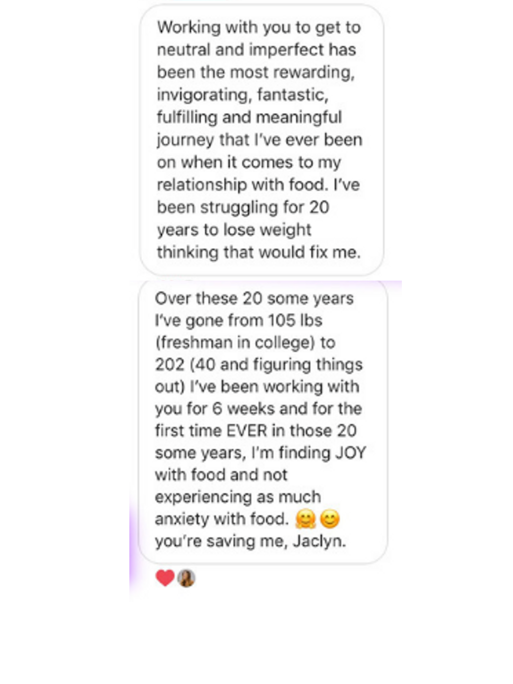 Private support community so you can check in with me, get all of your questions answered, and connect with like-minded people who are on the same imperfect eating journey as you